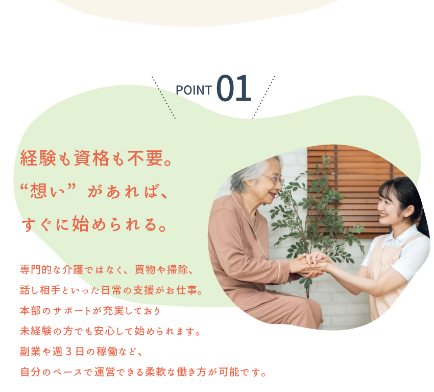 独立開業・フランチャイズ・代理店ならアントレ<毎週金曜更新!> 02/13更新全283件 [新着1件] ヘルプ 広告掲載をご希望の方 ログイン 会員登録無料 メッセージ お知らせ 気になる 閲覧履歴 独立情報を探す gnavi_list.htm 副業 ランキング 女性の独立 起業スクール コラム 業種から探す エリアから探す 契約タイプから探す 飲食デリバリー IT関連スマホ 修理クリーニング 小売コンビニ 塾スクール 美容サロンボディメイク 介護医療福祉 買取リサイクル 各種サービス 北海道 東北 関東 北信越 東海 関西 中国 四国 九州・沖縄 海外 フランチャイズ 代理店 業務委託 商材&事業支援 社員to独立 common_top.htm 独立、開業、フランチャイズTOP フランチャイズ 各種サービス 生活関連サービス 株式会社クラピスの独立・開業情報 株式会社クラピスのココに注目! closeup_top.htm 株式会社クラピスのココに注目!フランチャイズ 株式会社クラピス 「くらしのパートナー」高齢者の日常のお困り事を解決/資格・経験不要! 資料ダウンロード 説明会日程を見る closeup_main_top.htm 開業プラン 説明会日程 ココに注目! 企業概要 オーナーレポート 気になる 説明会日程を見る 資料ダウンロード 開業プラン 説明会日程 ココに注目! 企業概要 オーナーレポート closeup_main_bottom.htm closeup_bottom.htm common_bottom.htm common_footer_middle.htm common_footer_bottom.htm
