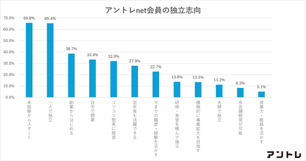 なお、性別で見ると、男性は「一人で独立」「積極的に事業拡大を目指す」「多店舗経営を視野に入れる」といった項目が全体に比べてより高く、一方で女性は「未経験からスタート」「コツコツ堅実に経営したい」「副業から始める」「定年後も活躍したい」といった項目が平均より高いという結果でした。女性のほうが、より堅実志向でスモールスタートを選ぶ傾向にあるようです。