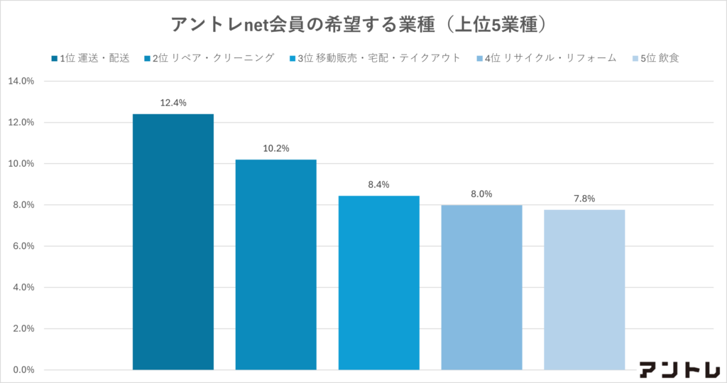さらに、希望する業種では「運送・配送」「リペア・クリーニング」「移動販売・宅配・テイクアウト」が上位を占めました。