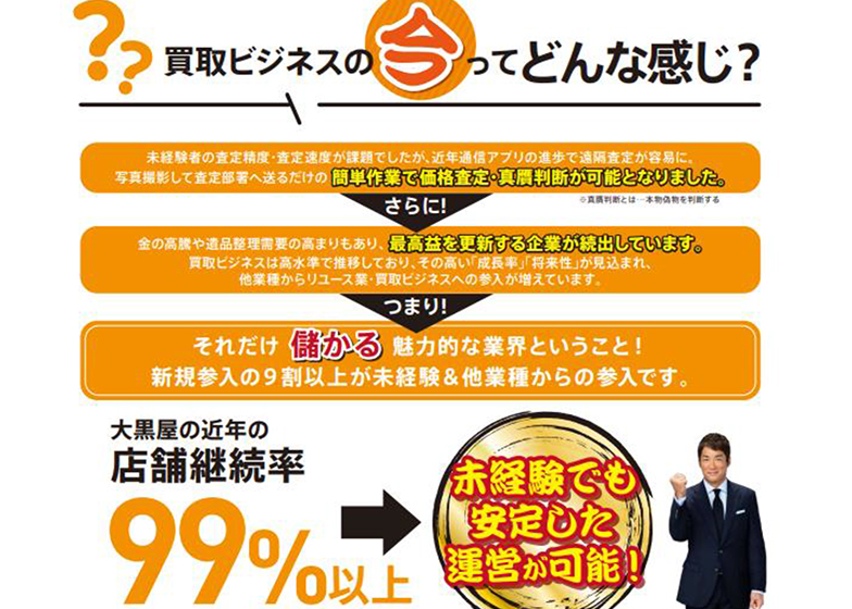 - 年齢・学歴等一切不問、未経験から独立できます。定年後から開業したオーナーもいます。接客や地域密着ビジネスに興味のある方、多店舗展開や質屋業、新規事業をお考えの方にも!