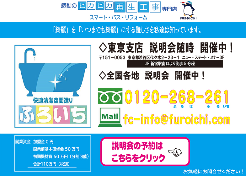 ■説明会参加特典として社長が書いた本プレゼント!28歳で脱サラした背景や成功へのステップ、失敗談まで赤裸々に語った、独立のためのバイブル本 ■地域性を把握した上で、仕事内容から収益まで、ふろいちフランチャイズにおける稼げる仕組みの詳細をご説明。全国の説明会では、代表の小林に直接、経営などの不安や質問をすることも可能です。※先着順受付 ◆説明会・相談会は先着順ではございますが、日時は相談可能です。