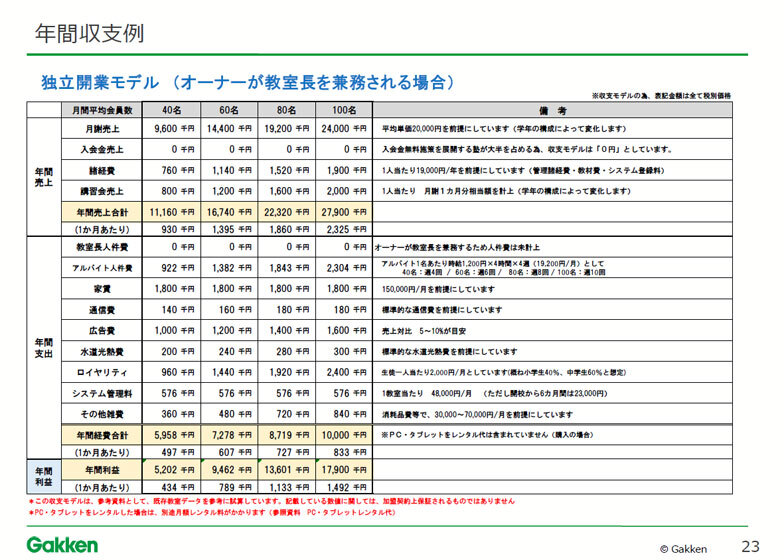 - 低いランニングコストで安定経営が見込めるビジネス!講師0人でも運営でき、教材作成や成績分析の必要もないので、人材教育も難しくありません。