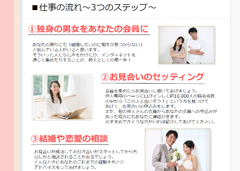 - 日本仲人協会の婚活ビジネスは、好きな時間に活動できるのが魅力の1つ。会社員の方の週末起業にも最適。本業にプラスして副収入を得てください。