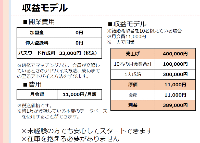 加盟金・研修費・ロイヤリティ0円だから、1名でも会員様を見つければ即黒字化できます。しかも、会員様から無理に費用を取る必要がないためお互い安心。この仕組みで年商3000万円の婚活アドバイザーも!(兵庫1名)