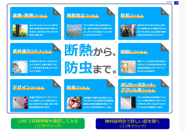 - ◆マンション、個人宅、オフィス、飲食店、工場などに、様々な機能(遮熱、紫外線対策、防犯、目隠しなど)を持つ窓ガラス用フィルムを施工します!