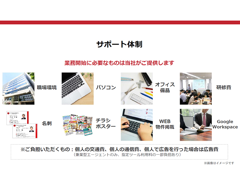 - 経験やスキルは不要。個人事業主ですが、当社のPCや机なども利用でき、資料などのテンプレートも提供。低リスクでスタートできます。