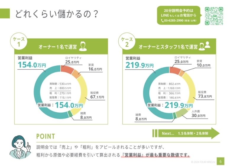 まずは事前に資料をダウンロードし、内容をご確認いただけますようお願いいたします。私たちは、会ってお話しすることで深く理解しあえると考えているため、対面での説明会を大切にしています。深い理解に基づいた個別サポートができるからこそ、加盟店様は「勝てる経営」を実現しています。説明会では、成功店舗はもちろん、苦戦している店舗の収支表も公開!どんなことも包み隠さず丁寧にご説明します。※WEB/電話説明会にも対応
