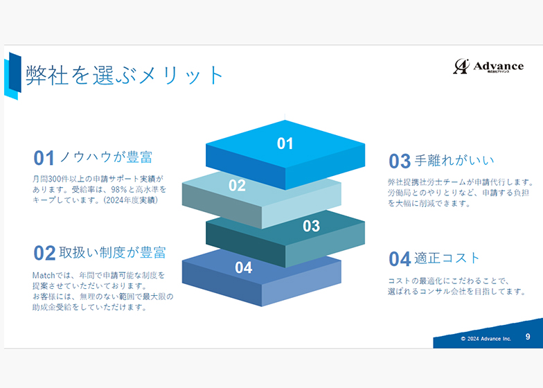 - 多くの中小企業は助成金を活用しきれていません。アドバンスは未活用の助成金を見つけ、企業に最大の利益を提案しています。経済不安定な中、助成金は重要な資金調達手段となり、フル活用する企業は競争優位性を持ち収益を増加させることができるため、今後も助成金支援の需要は拡大し続けていきます。
