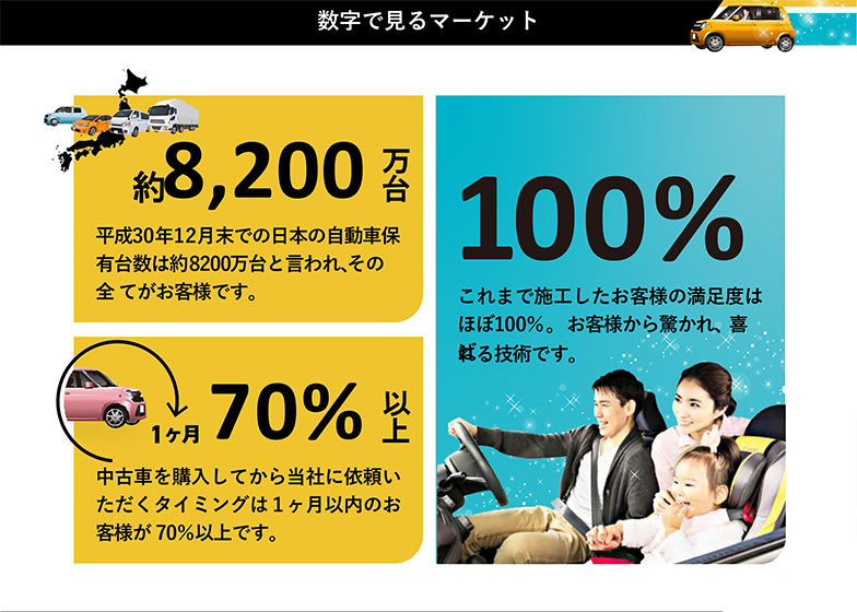 - 日本の自動車保有台数約8200万台がお客様。市販のものでは解決できない車内の臭いにお困りの方は多数。特に中古車の需要は大きく依頼の70%以上が中古車購入から1ヵ月以内。弊社中古車選びのサービス「みんなのクルマ選び」でも数多くの引き合いがあります!