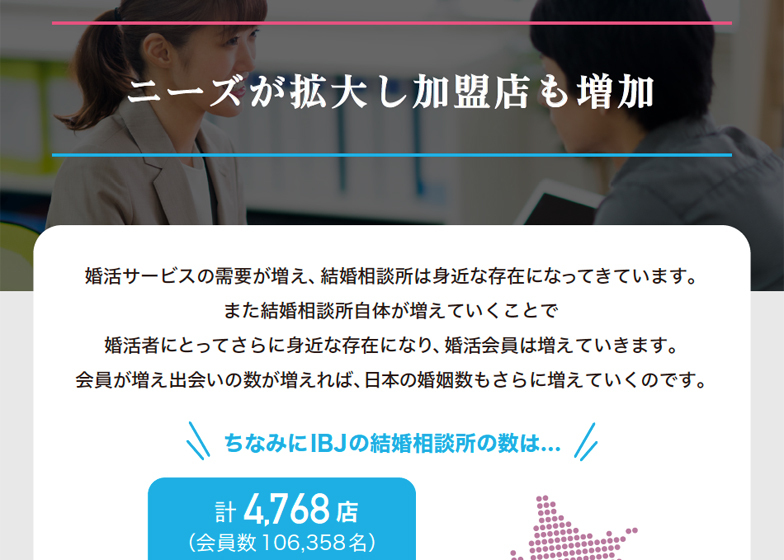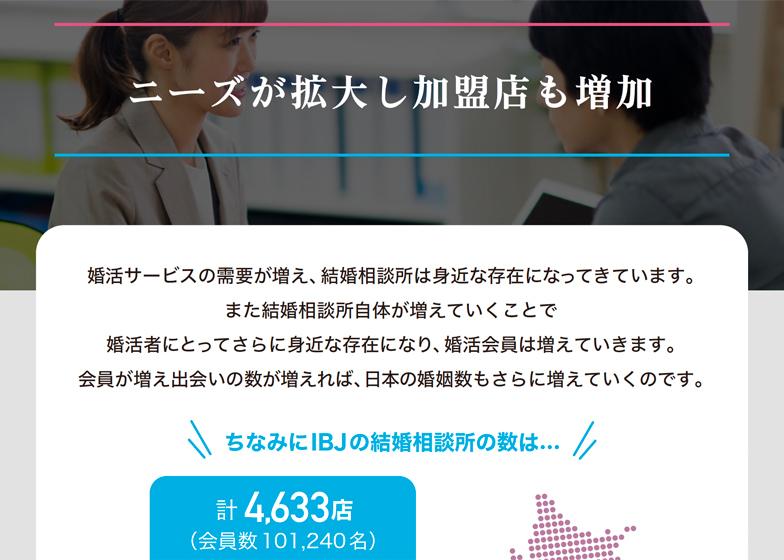 - 独自の婚活システムや月30件以上の研修等、多くの加盟 店にIBJが選ばれる理由を公開!