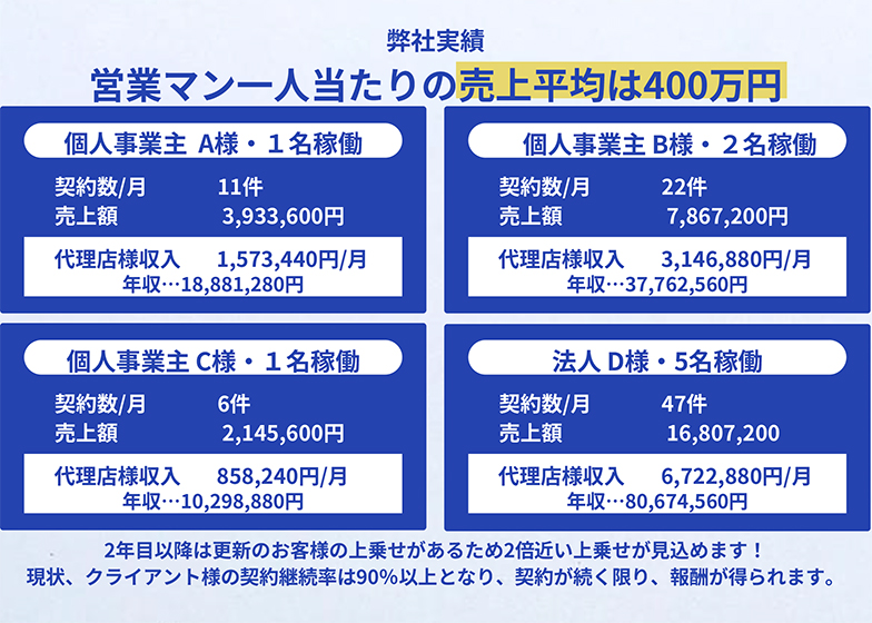 - クライアントの契約継続率92%以上の人気商材だから未経験でも提案のしやすさは抜群。契約後は本部に丸投げOKのサポート体制。