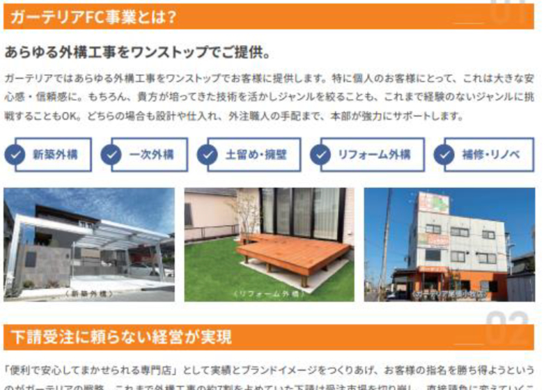 - 外構工事に関する特別な知識や技術は必要なし!工事は職人に外注しますので、オーナーは営業や職人管理といった店長業務が中心となります。