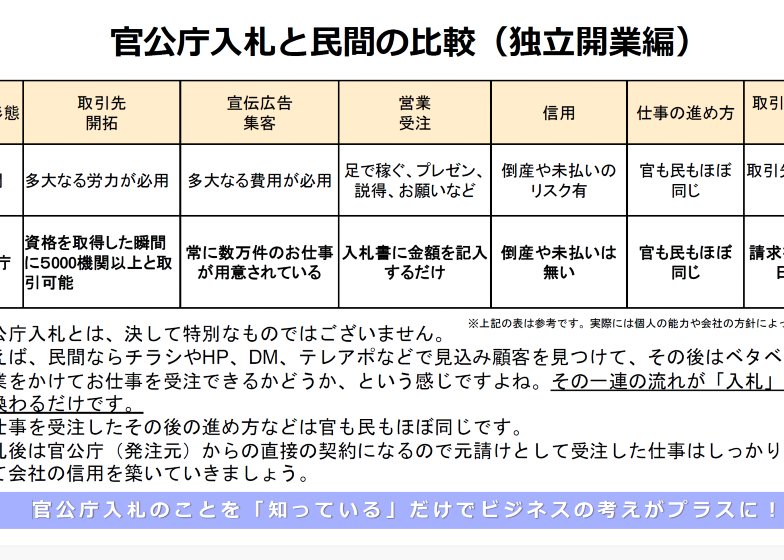 - 官公庁入札と民間の比較表を掲載。官公庁入札のメリットが詳しくご理解いただけます!