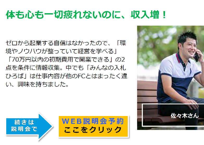 ●ビジネスモデルや商品??サービス 説明会を聞けて納得しました。サラリーマンしかしたことがないので、やってみないとわからないことが多いと思いますが、前向きにやってみたいと思いました。 ●企業、担当者の対応姿勢??雰囲気に関して Web説明会は分かりにくいことも多かったのですが、すごくわかりやすくて、あっという間でした。 ●サポート体制について こちらもはじめてみないとまだわからないこともありますが、画面見せていただいた時にはそんなに難しくないと思いました。 ●収益モデル、開業エリアの話に関して 実際業者を探すこと、お願いすることなどやったことがないので心配ですが、相談しながら進めたいと思います。 ●その他良かったとこ よろしくお願いします!アントレ内でメッセージが届いていると思っていなく、届いていないとメールしてしまいました。すみません。(50代・女性)