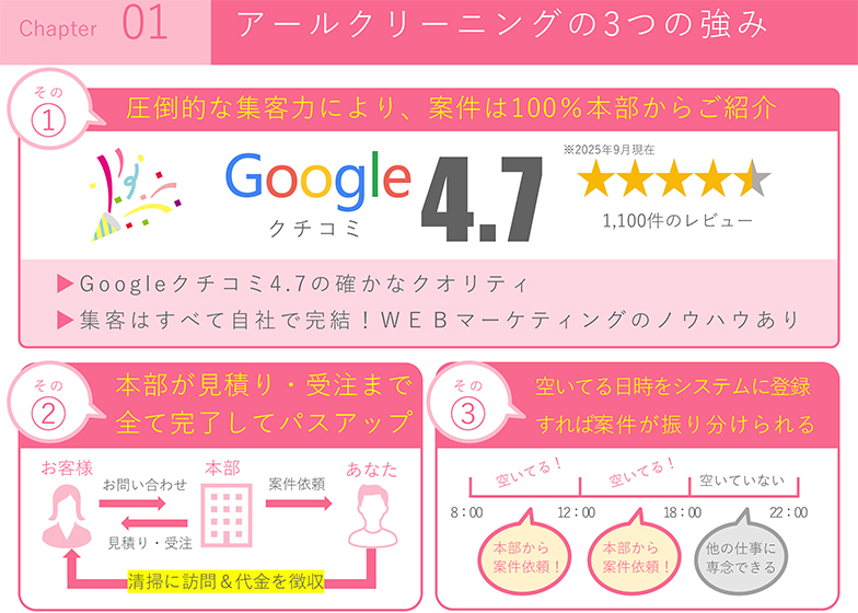 - 「アールクリーニング」は作業実績50万件以上の確かなブランド力と、WEBマーケティングの知見で口コミの評価が高く、圧倒的な集客力を誇っています。代理店は空いている日程を登録するだけで、自動的に案件が入ってくるシステム。集客に当てる活動は一切不要で、作業に専念できるのが大きな魅力です。