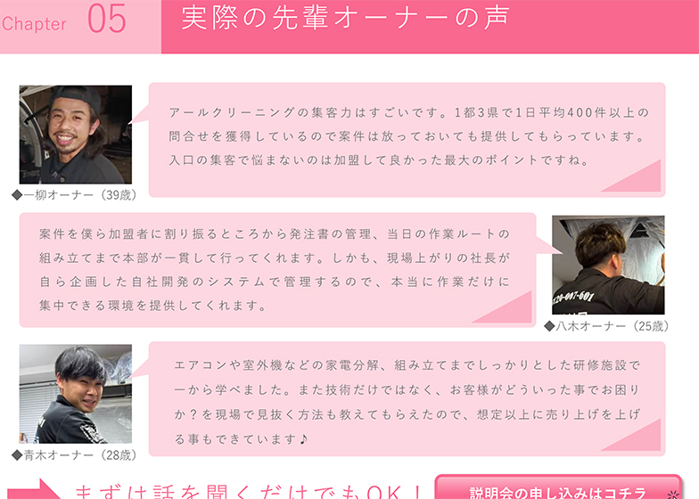 - 集客は本部が100%実施。作業実績50万件以上の確かなブランド力と、WEBマーケティングの知見で圧倒的な集客力!だから案件はお断りしているほど!
