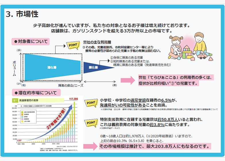- 1クラスに3人弱が発達障がいの可能性を持つ一方、そのうち療育サービスを受けているのははわずか1割。未利用者約29万人。時代が求めている事業です。
