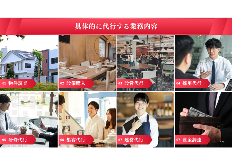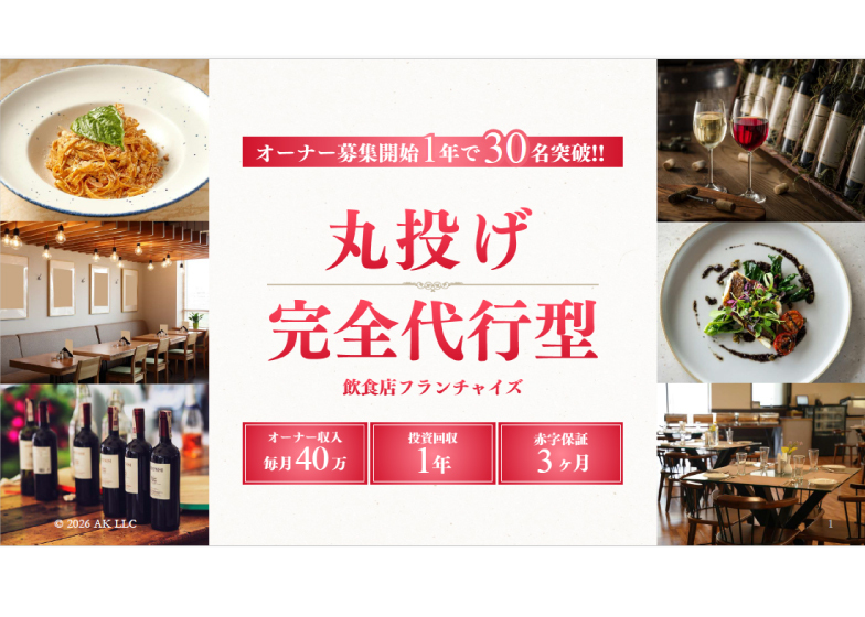 - 飲食業界未経験の方も安心!本部が運営を代行し、早期黒字化/収益拡大を実行いたします。不安の少ない環境で、実践的に飲食経営を学ぶチャンスです!