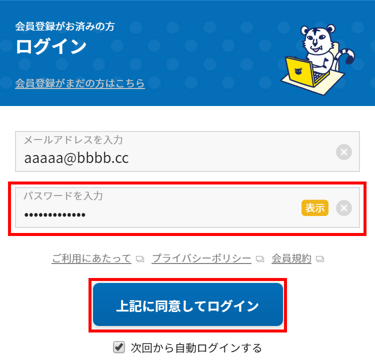 - 貼り付けが完了すると、「パスワード」欄に●印が入力されます。「上記に同意してログイン」ボタンをクリックしてください。