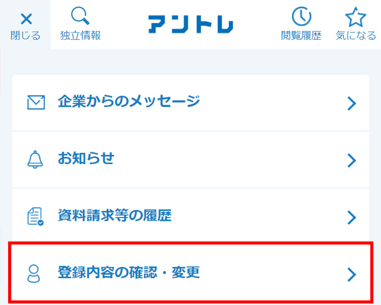 資料請求や説明会申込みされる際の送付先ほか、あなたのプロフィール情報や、メール配信サービスの設定などを確認いただくには、アントレにログインした上で、画面左上部にある「メニュー」ボタンからメニューパネルを表示、「登録内容確認・変更」をクリックしてお進みください。