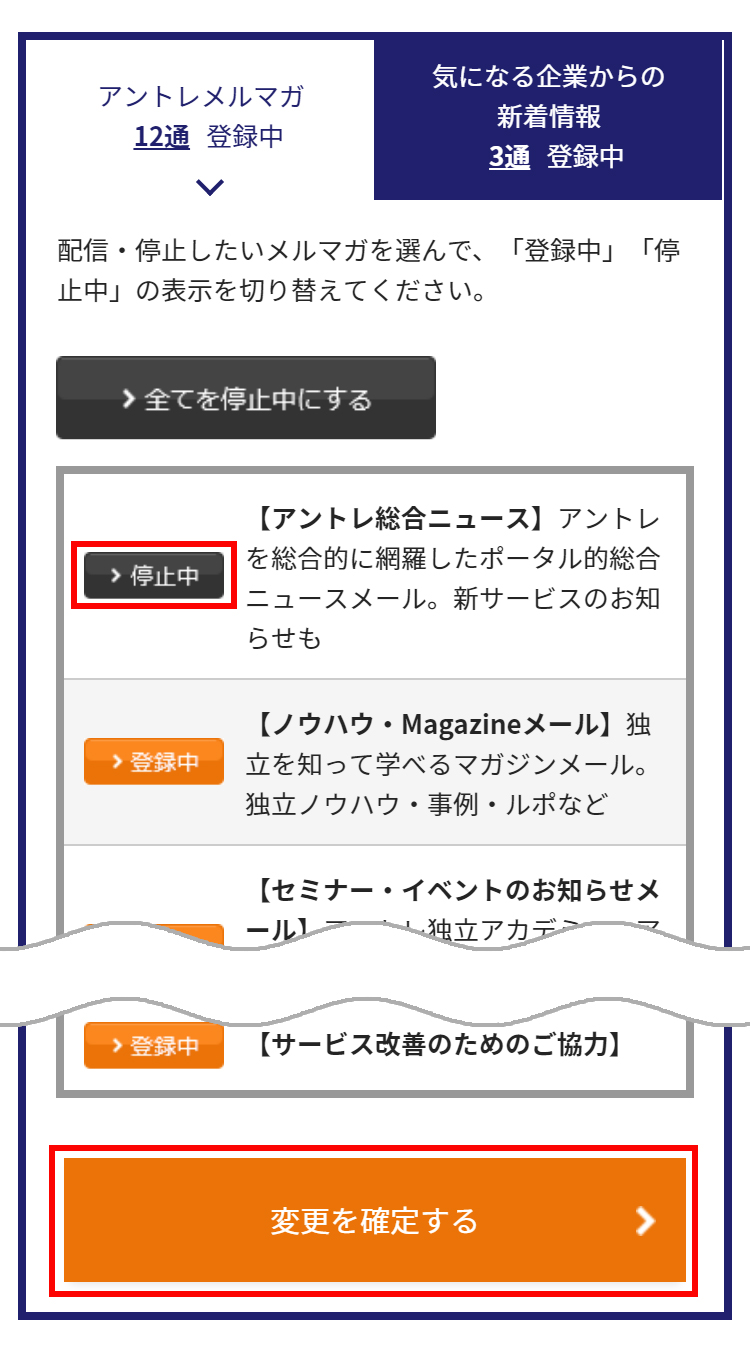 ▼「アントレスペシャルオファー」、すべての「気になる」企業からのメール、「アントレメールマガジン」の配信停止方法
