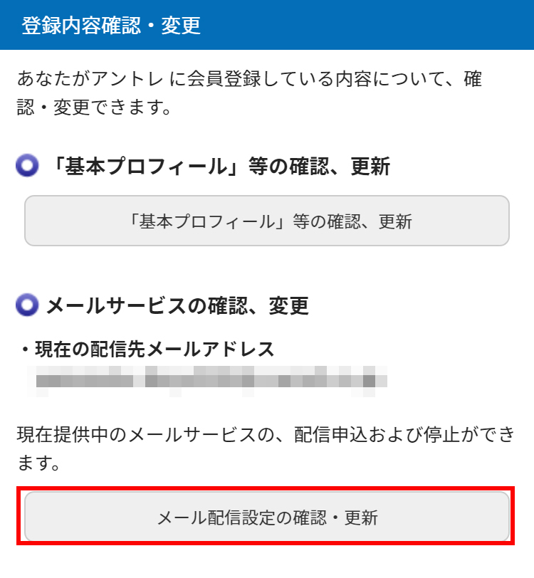 - 登録内容確認・変更画面の「メール配信設定の確認・更新」をクリックします。