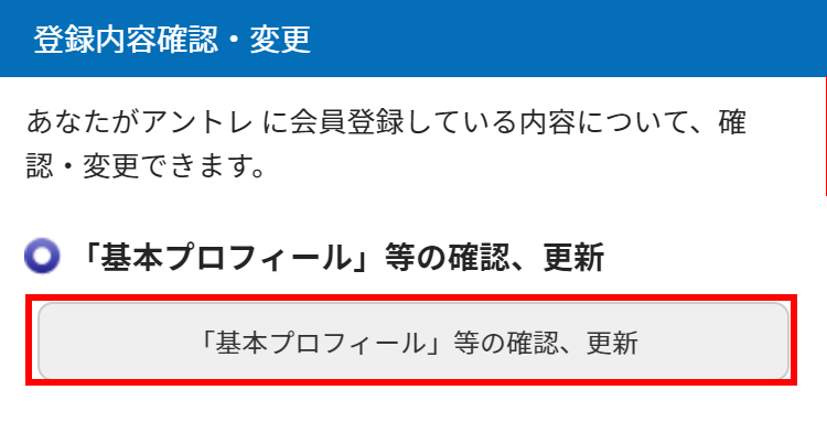 - 登録内容確認・変更画面の「基本プロフィール等の確認、更新」ボタンをクリックします。