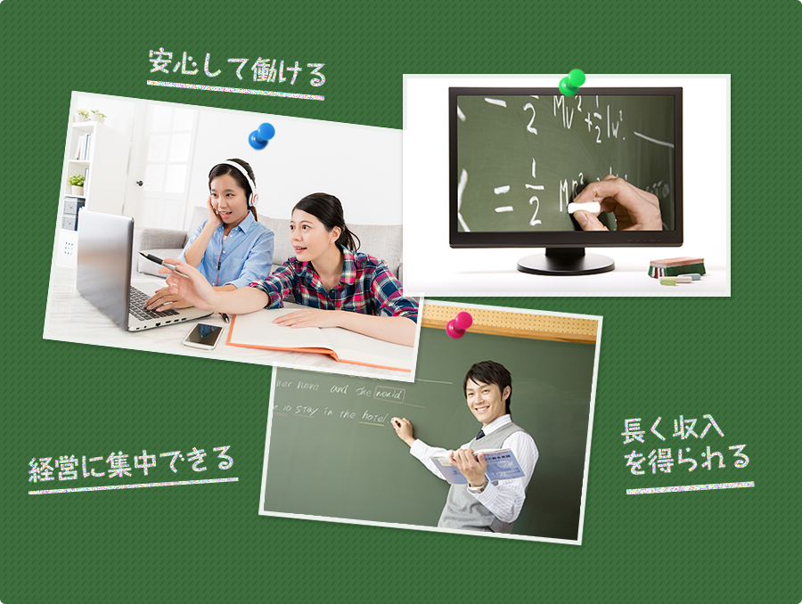 基本的には学生アルバイトなどの講師を雇うことで、自らはオーナー業に専念することが可能です。その時に強い味方となるのが、FC本部。講師の募集・採用・教育についてのノウハウを提供してもらえるので、安心して開業準備が進められるでしょう。場合によっては本部から応援が来てくれたり、加盟者同士で助け合ったりできるなど、FCならではのメリットも多いんです。